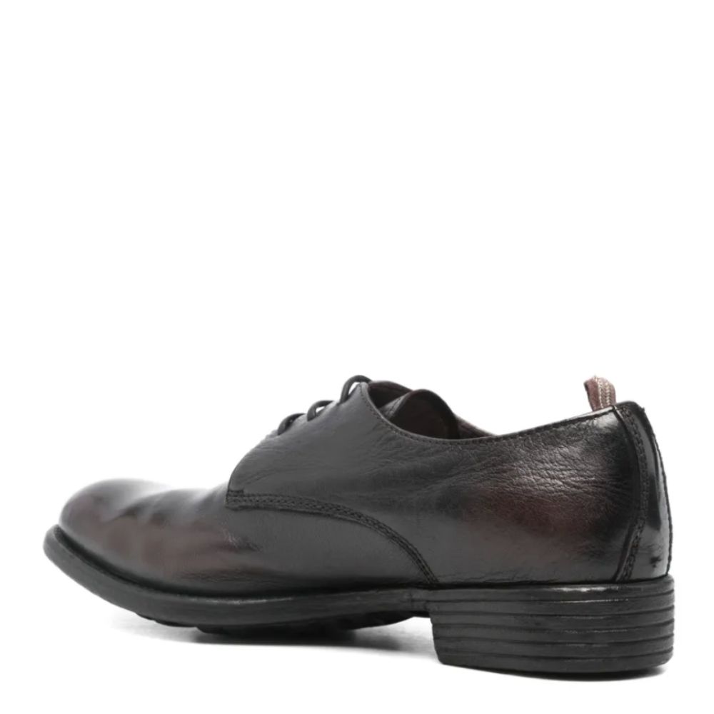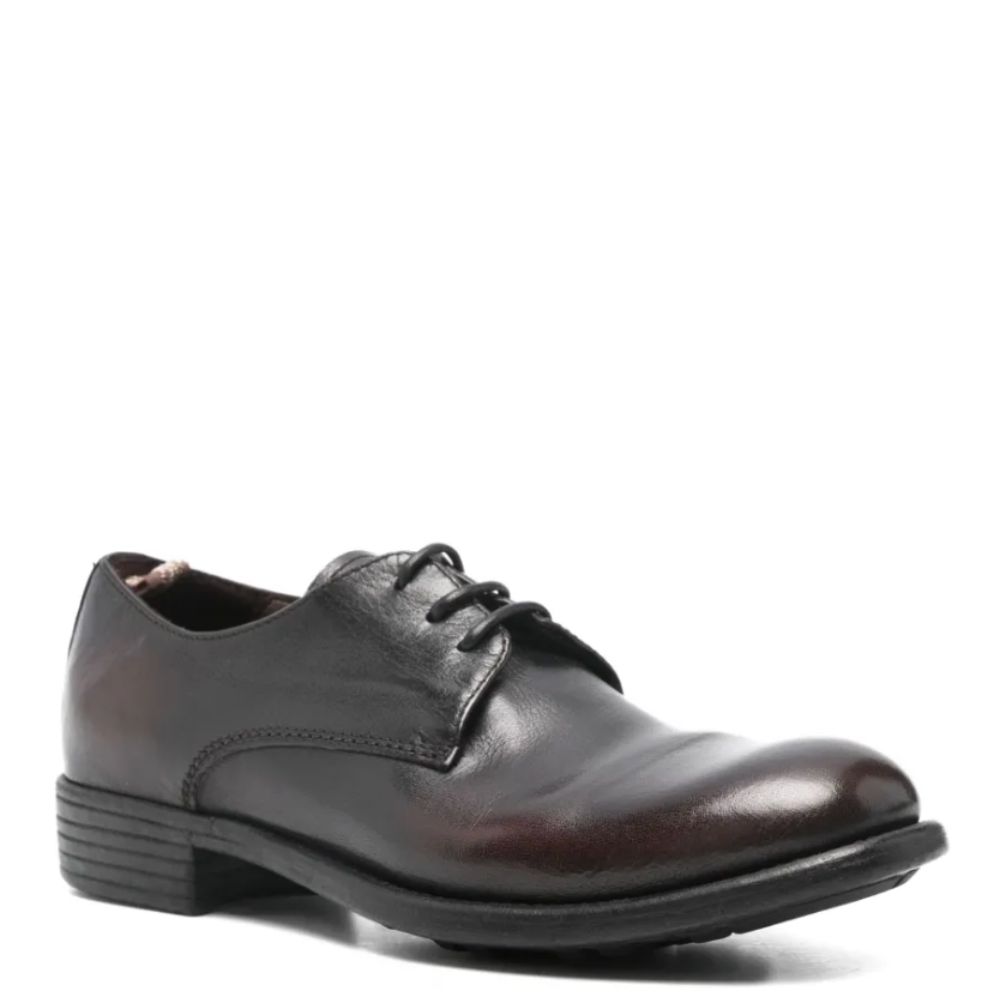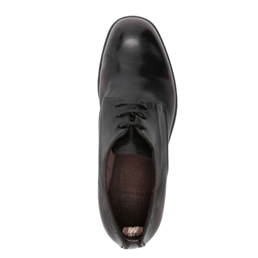 Brauner Derby aus Leder mit Schnürverschluss, dünnen gewachsten braunen Schnürsenkeln, einer Fersenschlaufe und einer Gummisohle. Handgefertigt in Italien.