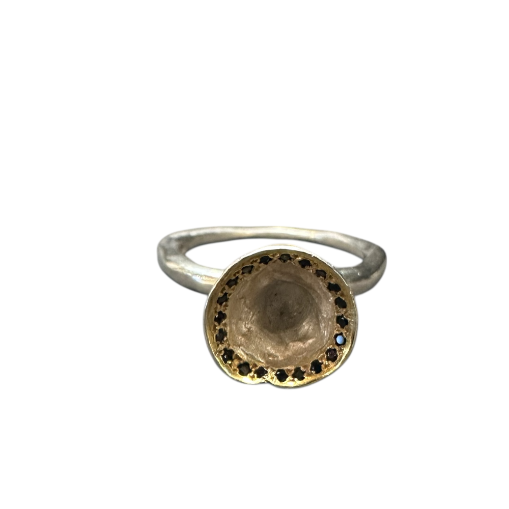 Rosa Maria zilveren Noufa ring met zwarte diamanten gezet in goud en paarlemoer.