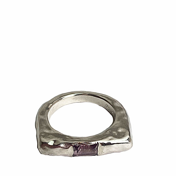 Zilveren ring met onregelmatige structuur in een vierkante vorm met een ingelegde roze saffier van 0,9kt