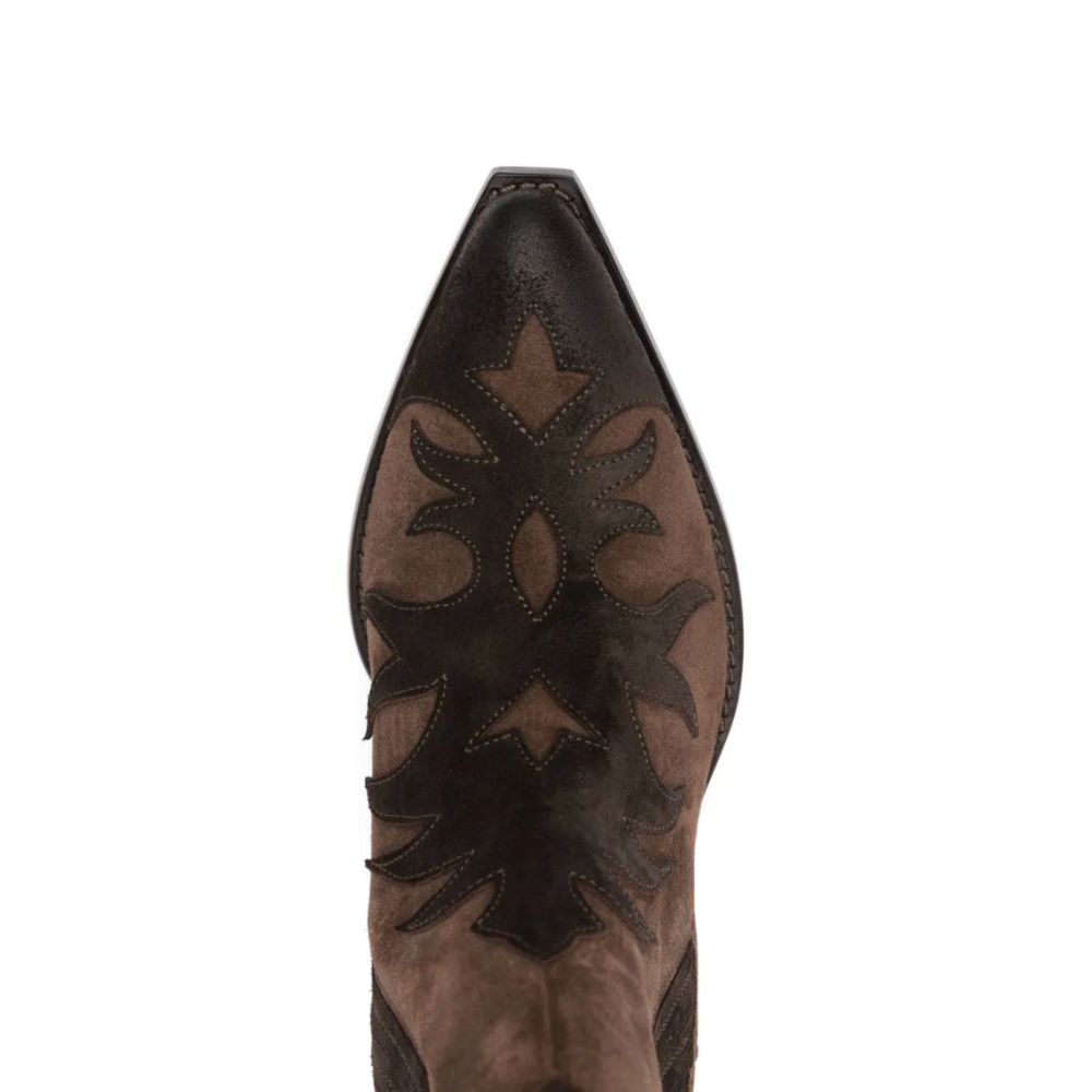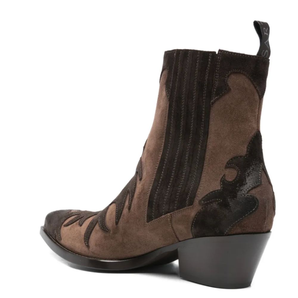 Cognac kleurig suede gevlamde western laars met donkerbruin suede details, hak 3,5cm